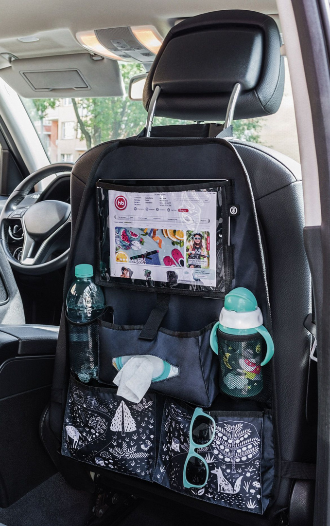 Чехол-органайзер Happy Baby (Хэппи Бэби) незаменим в поездках автомобиле – игрушки, средства гигиены, еда и другие полезные вещи всегда будут под рукой. Помимо стандартных карманов имеются держатели для бутылочек, отделение для салфеток и прозрачный пластиковый карман для планшета, который даёт малышу возможность смотреть любимые мультфильмы прямо в дороге. Органайзер легко крепится к подголовнику, а также к нижней части сиденья (для большей надёжности). Прочный материал защитит спинку переднего сиденья автомобиля от загрязнений и следов обуви малыша.